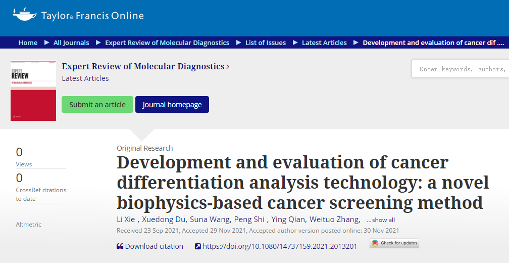 摘要:安派科生物联合复旦大学生命科学学院和上海长海医院撰写的《基于创新生物物理的CDA技术应用于肺癌疗效评估的临床实验和结果》的学术论文被美国癌症研究协会American Association for Cancer Research(AA
